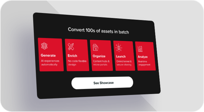 Convert 100s of assets in batch Generate Enrich Organize Launch Analyze AI experiences No code flexible Content hubs & Omnichannel & Real-time automatically design micro-portals secure sharing engagement See Showcase