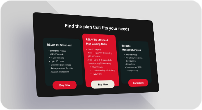 Find the plan that fits your needs RELAYTO Standard Plus Closing Delta Bespoke RELAYTO Standard Managed Services • Free 30 Day trial • Enterprise Pricing • Free - 1 Hour VIP Onboarding • Template Design €4.500/Month (€2.000 value) • PDF Library Conversion • 14 Day free trial • Free - Up to 3, 10 page digital • Team training • Upto 20 Users experiences (€3000 value) • Integrations • Unlimited Experiences ⚬ 1 built for you • For companies 1000+ • Enterprise-level Security ⚬ 1 co-built with you in training employees only • Custom Integrations ⚬ 1 you build Contact Us Buy Now Buy Now