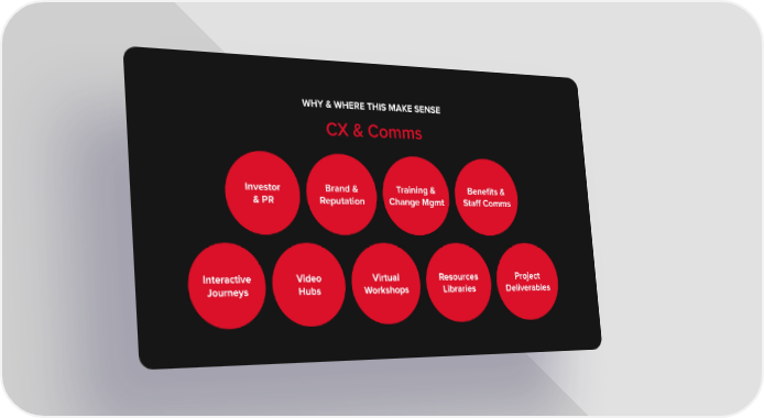 WHY & WHERE THIS MAKE SENSE CX & Comms Investor Brand & Training & Benefits & & PR Reputation Change Mgmt Staff Comms Interactive Video Virtual Resources Project Journeys Hubs Workshops Libraries Deliverables