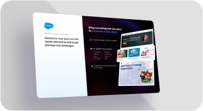 Bring everything into one place to accelerate & close deals RELAYTO anchor client story Tailored messages, CTAs and content Salesforce now turns one-off assets into end-to-end buyer journeys and campaigns One platform. Many formats Presentation Microsite Flipbook Content Hub Video Web Doc Infographic Blog AI-assisted selling with interactive presentation