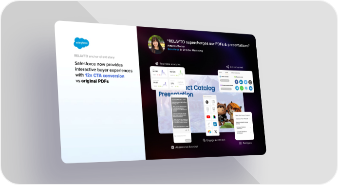 “RELAYTO supercharges our PDFs & presentations” Amanda Backer Salesforce Sr Director Marketing RELAYTO anchor client story Real-time analytics Omnichannel Salesforce now provides interactive buyer experiences with 12x CTA conversion vs original PDFs Engage & interact Navigate AI-powered live chat